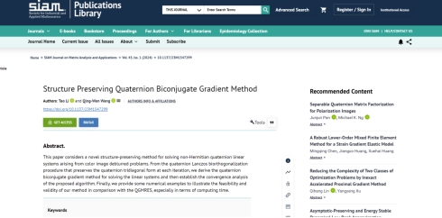 近日,pg电子官方网站李涛博士以第一作者署名的文章“Structure Preserving Biconjugate Gradient Method”在国际数值代数领域权威期刊《SIAM Journal on Matrix Analysis and Applications》正式发表,文章链接https://doi.org/10.1137/23M1547299。